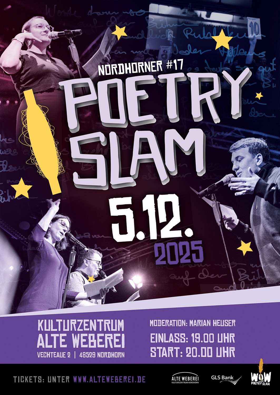 ☆ 0 2 . 1 2 .☆ Poetry Slam ALLSTARS #4 - Schauspielhaus BOCHUM ☆ 0 5 . 1 2 .☆ Poetry Slam Nordhorn #17 - Alte Weberei NORDHORN ☆ 1 3 . 1 2 .☆ WoW Poetry Slam #45 - Kulturhaus LÜDENSCHEID alle Shows